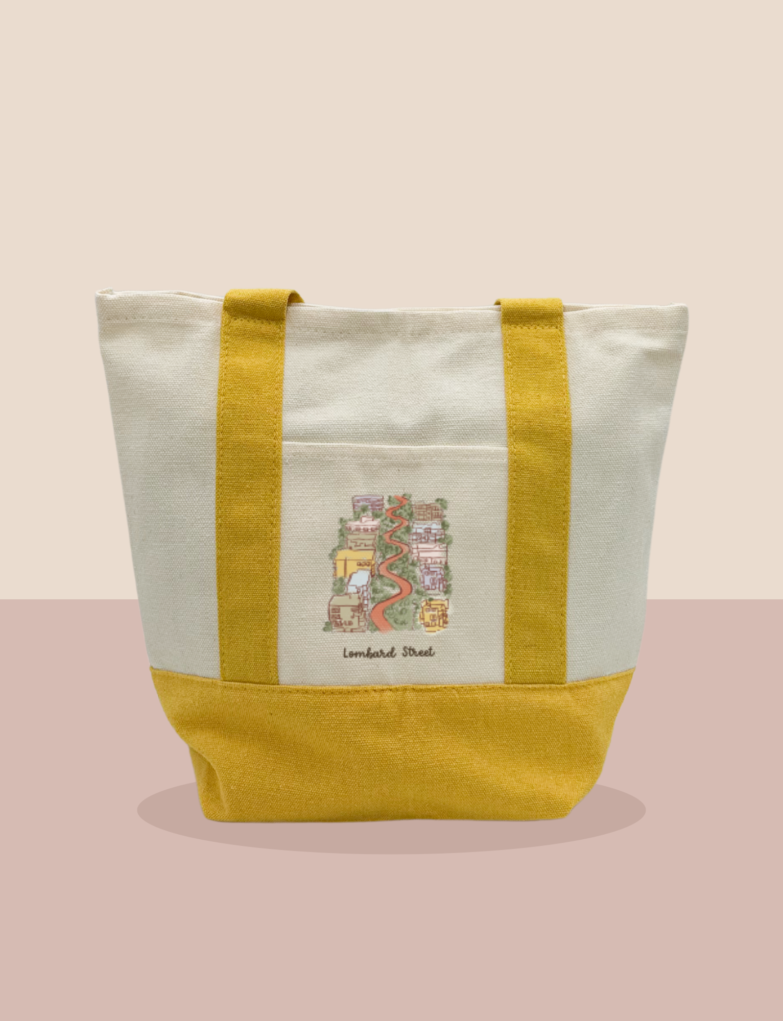Our Red and Green Mini Totes take you on a twisty ride through San Francisco with a hand-drawn homage to Lombard Street, the most famously crooked street in the world. With its iconic curves and lush charm captured by our talented designer, this tote is a fun and functional way to show your love for the city’s quirky spirit. Whether you’re strolling through SF or sending a little hometown love, it’s the perfect sidekick.